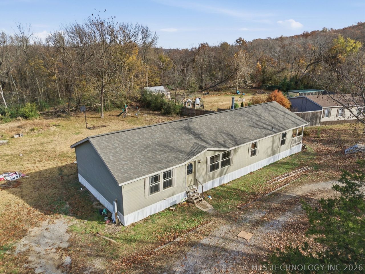 Lots of updating in this doublewide mobile home on 1 acre that sits conveniently on a shared private road off E 490 Rd (Hwy20) and Will Rogers Turnpike! It features two living areas, woodburning fireplace, an above ground pool w/ liner and storm shelter. New Hot Water Tank (Jan 2024), Fresh Paint throughout (Mar 2025), New Roof (Dec 2024), New HVAC & ductwork (Mar 2025). Seller is offering $5,000 flooring allowance w/ strong offer. All appliances stay!